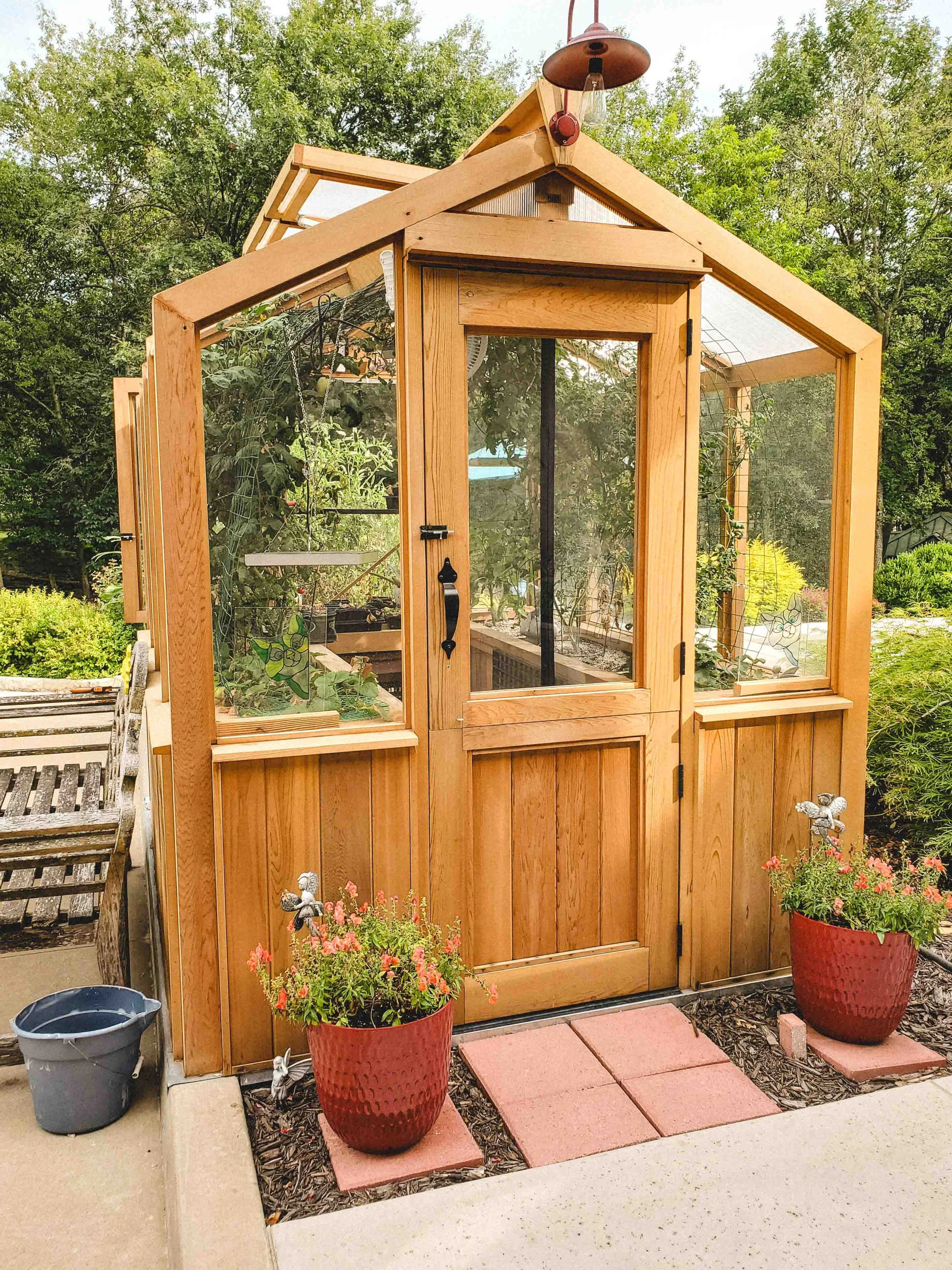 Featuring 30” basewalls, a Dutch door, 6mm polycarbonate roof and sides, automatic roof vent openers, and single shelf cedar benches.